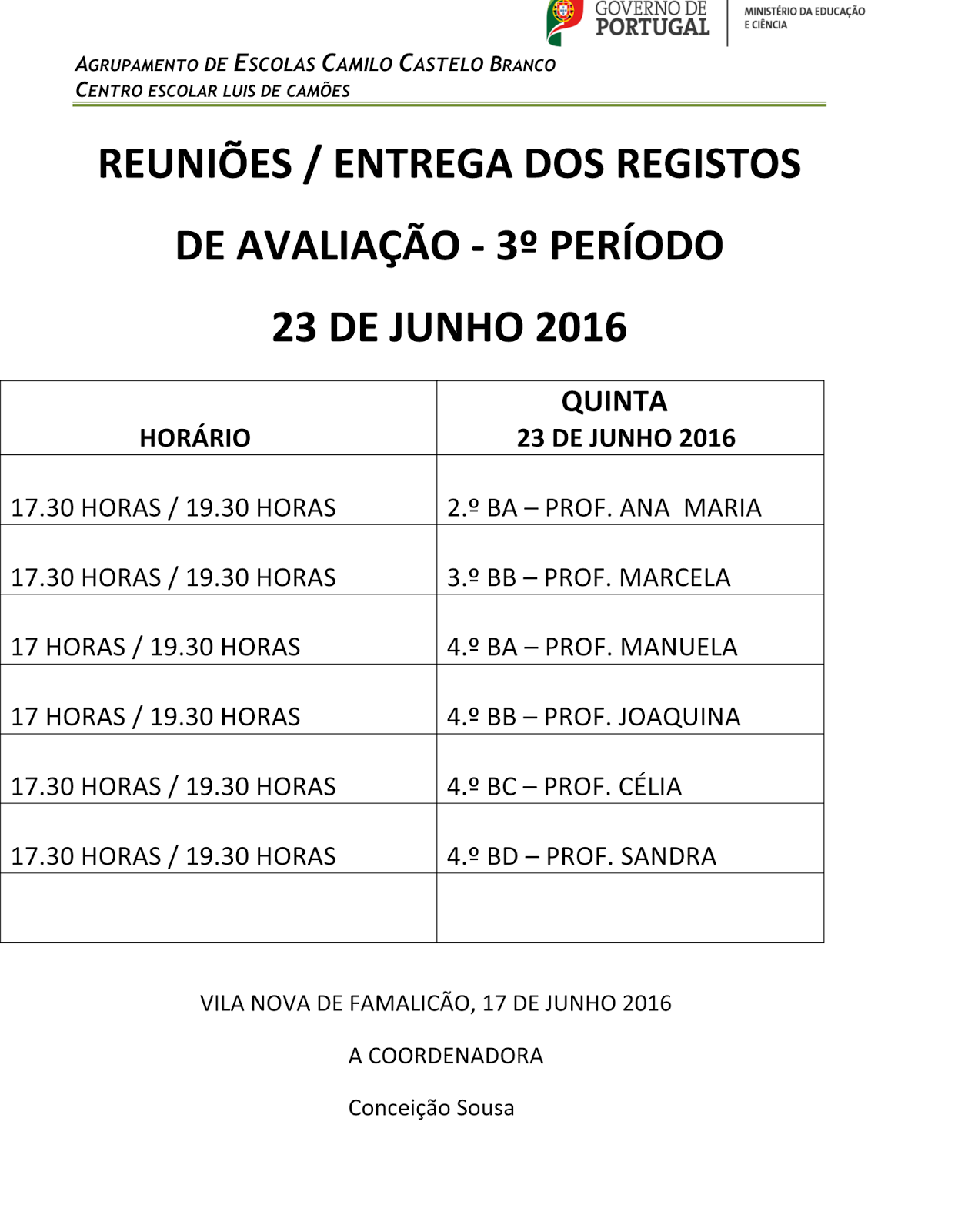 A pedido da coordenação do Centro Escolar Luís de Camões publicamos as tabelas com os horários das reuniões de avaliação relativas ao 3.º Período.